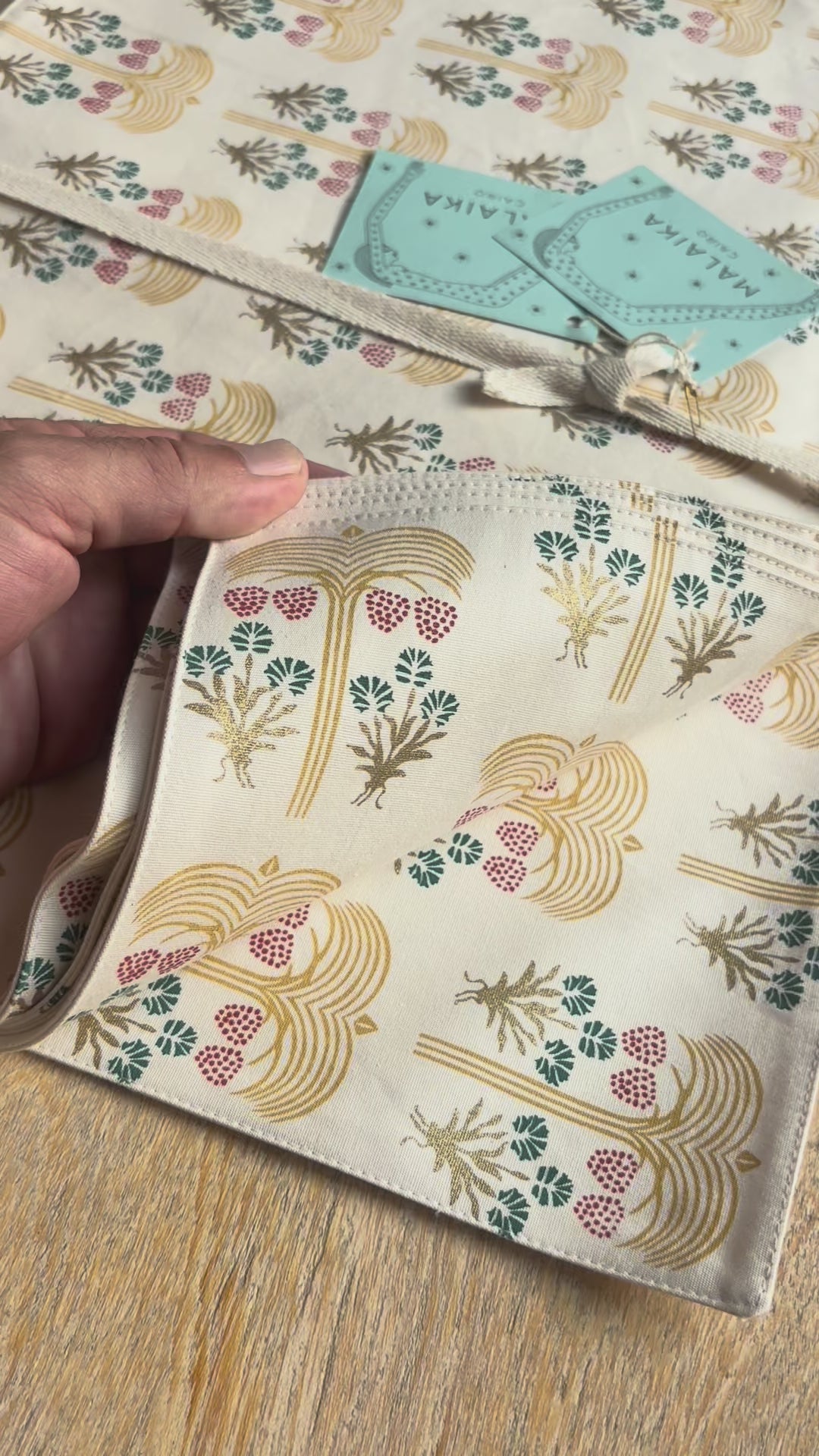 Crafted from natural Egyptian cotton canvas, these reversible oasis placemats feature a silkscreen print inspired by Islamic tile art and are machine washable.